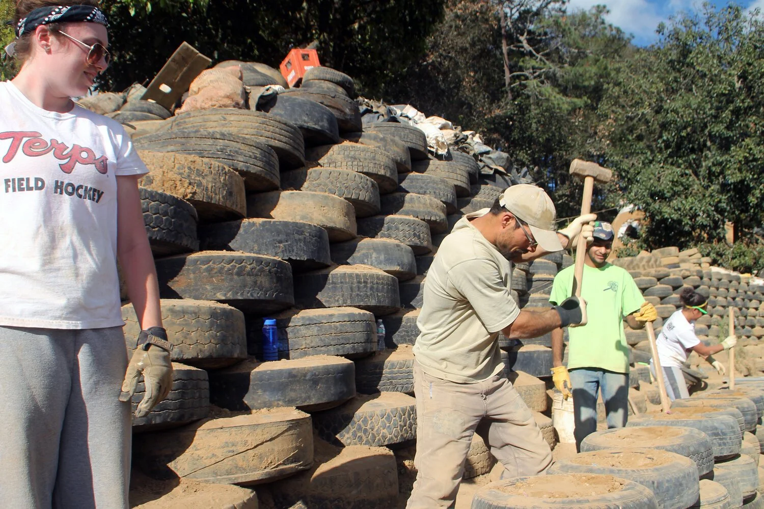 Group of volunteers working on building a tire wall, some holding hammers, wearing gloves, and casual clothing, outdoors during daytime.